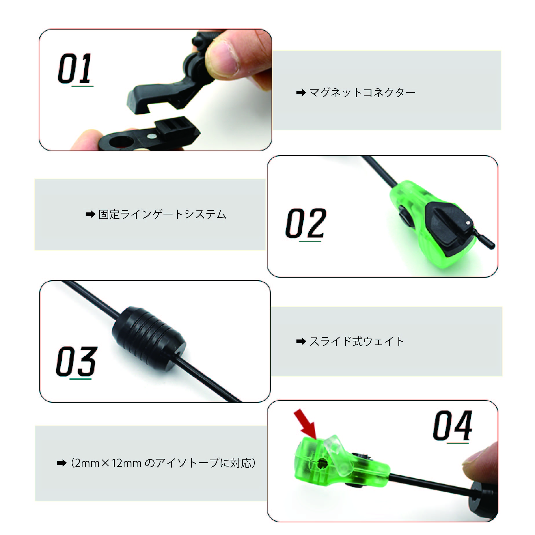 ・短いアームと固定ラインゲートシステム、さらにアーム上には21gのスライディングウェイトを搭載し、風や流れに左右されにくい安定したシグナルを実現します。