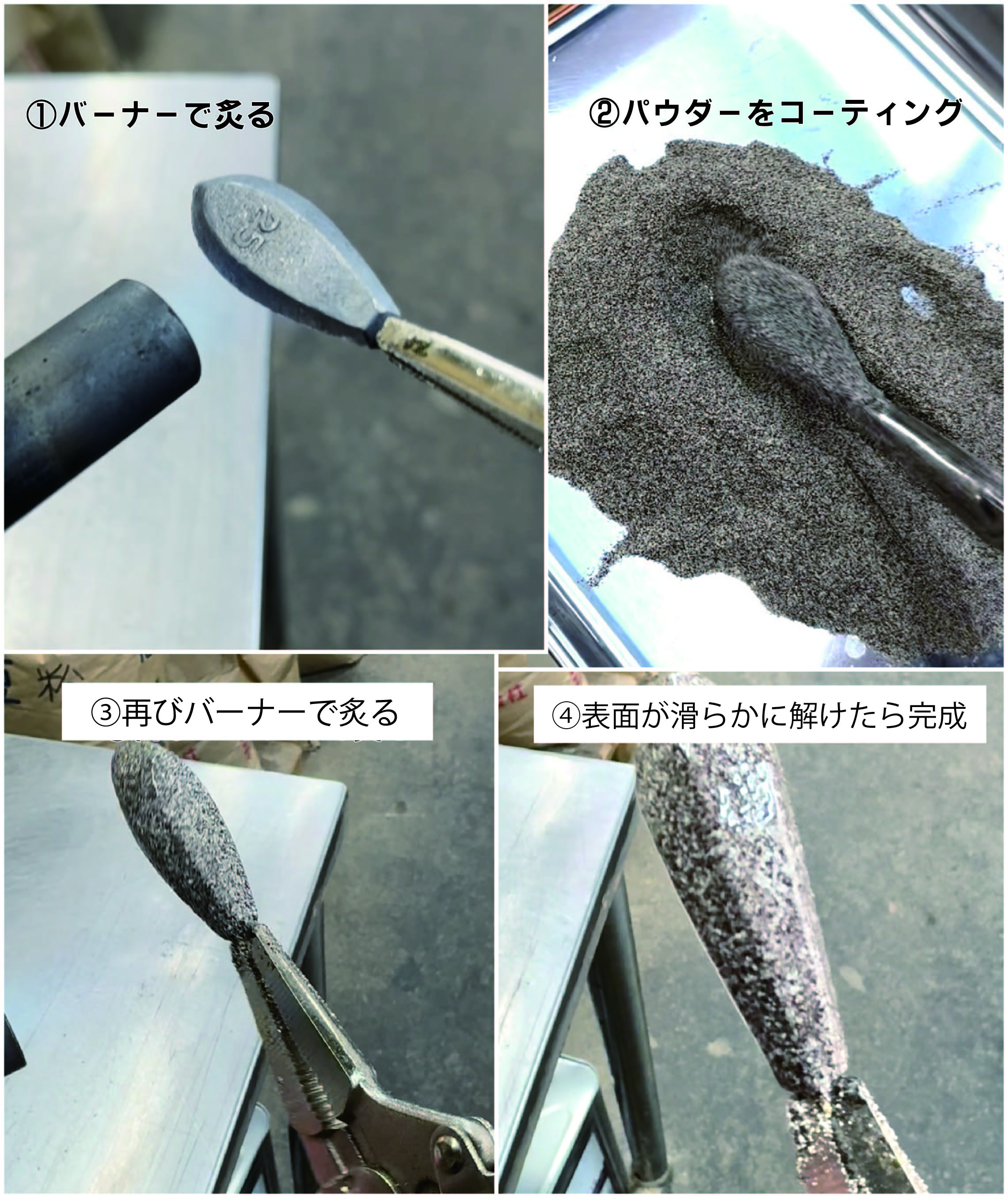 ③ コーティングパウダーをふりかけたらもう一度バーナーで炙り、表面が滑らかになるまで加熱して下さい。
