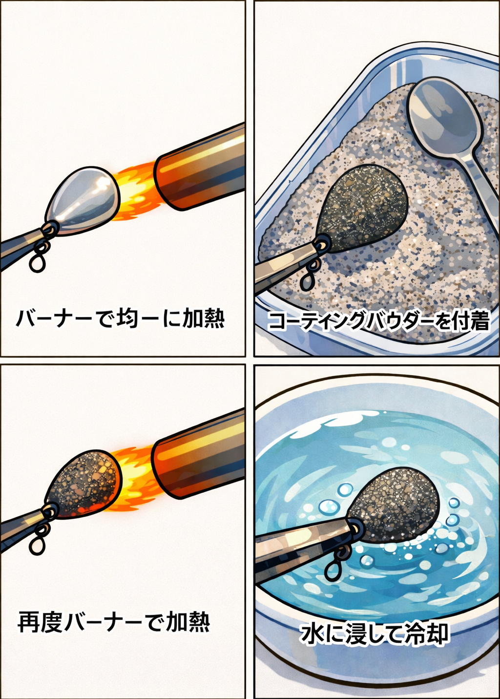 ② 加熱したオモリに、コーティングパウダーをまんべんなく振りかけます。